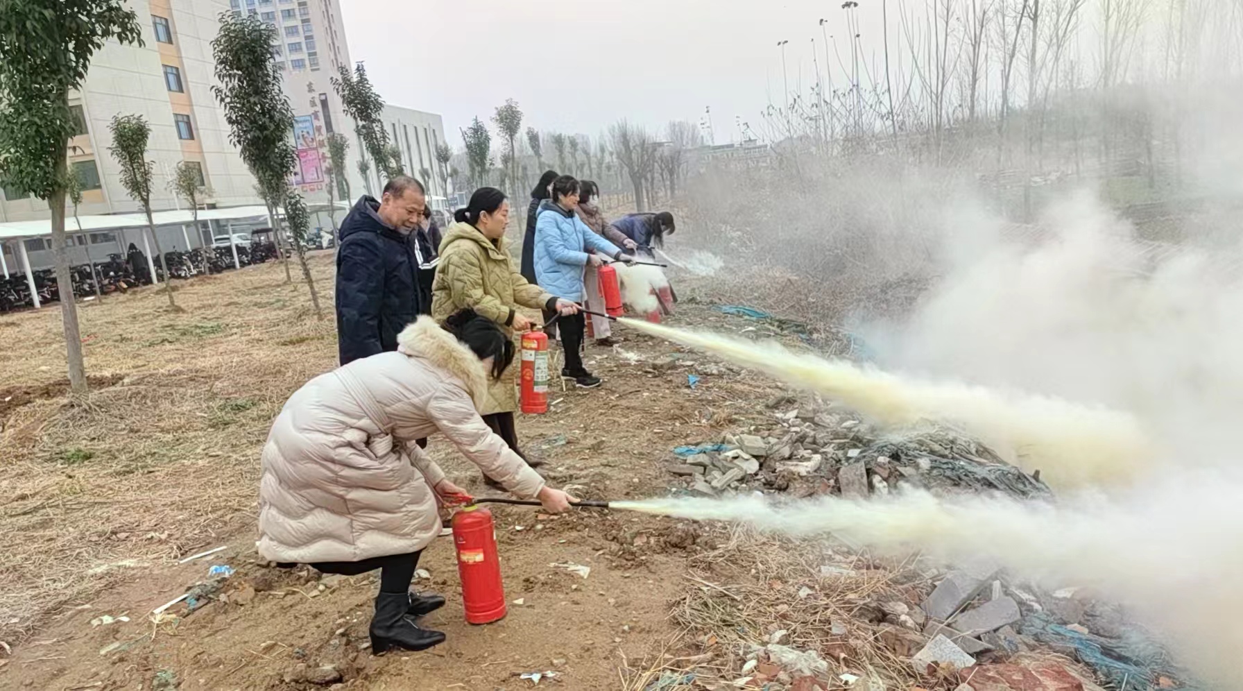 保卫处消防科工作人员现场演示灭火器的使用方法,并组织参训人员进行现场操作,让大家学会了火灾扑救基本常识和灭火器使用方法。