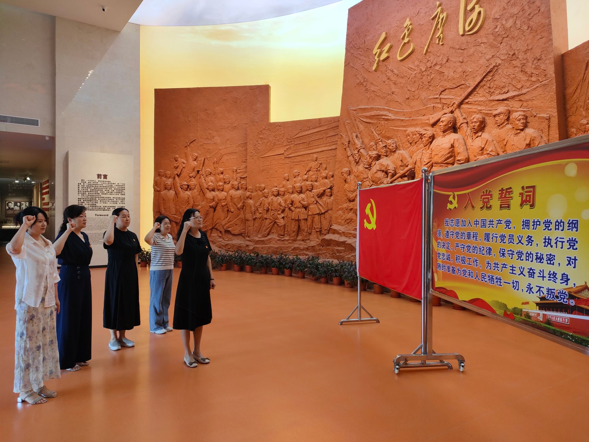 在庄严肃穆的大型烈士群雕像前,全体党员佩戴党员徽章,面向党旗举起右手,在党支部书记周艳丽的带领下,重温了入党誓词。