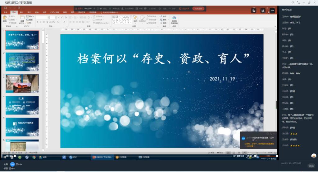 11月19日上午,档案馆与校史馆举办了档案人员业务工作专题培训会。因疫情防护要求,此次培训采用在线方式进行,全校专兼职档案员100余人参加培训。